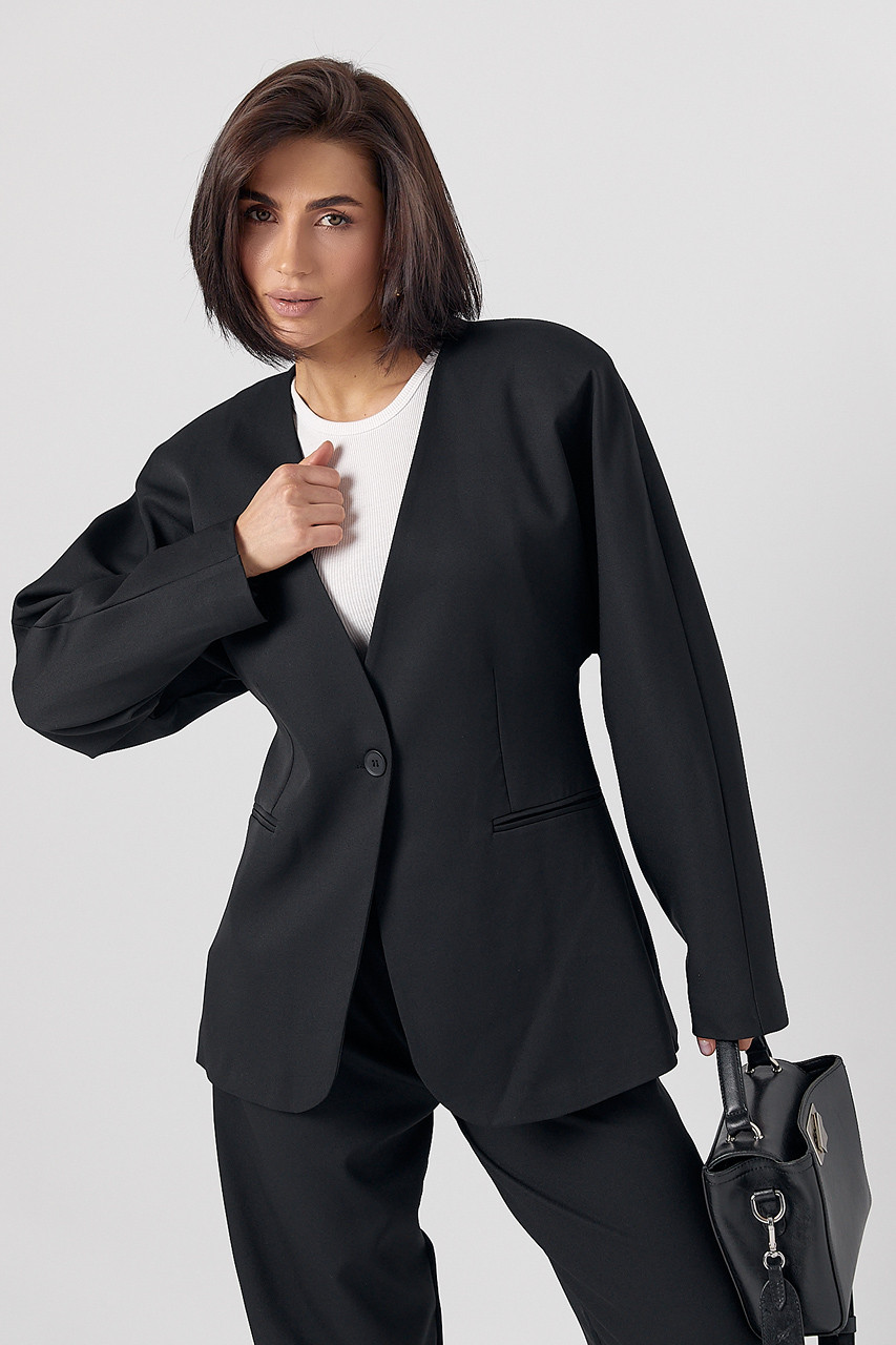 Класичний жакет без коміра — стильний і елегантний елемент гардероба, що поєднує в собі витонченість і комфорт. Модель має приталений крій без проймів, що надає легкості та сучасного вигляду.